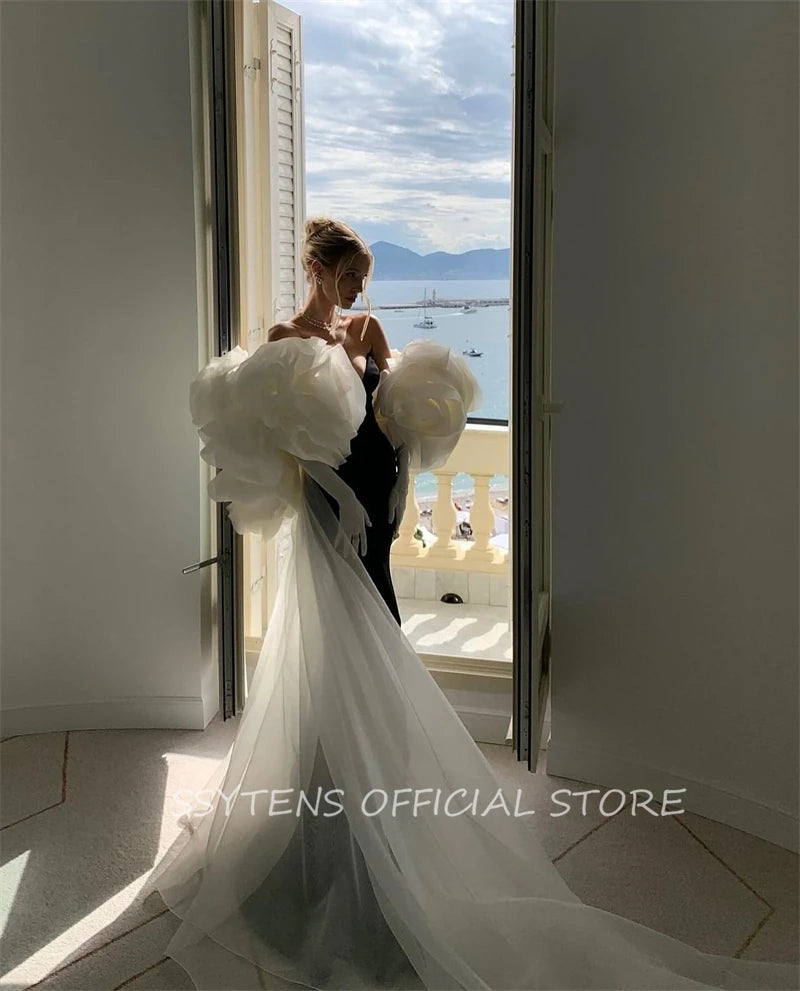 Black Evening Dresses for Women Customized Luxury White 3D Flower Jacket Formal Occasion Dress Floor Israel Long Prom Gowns