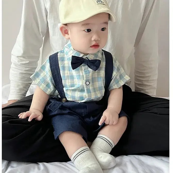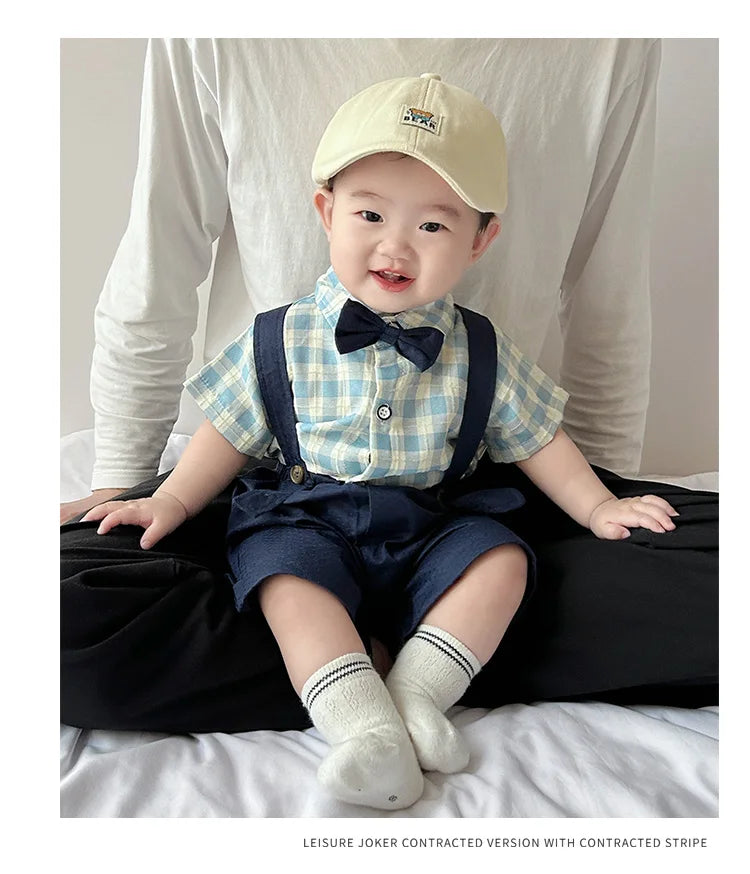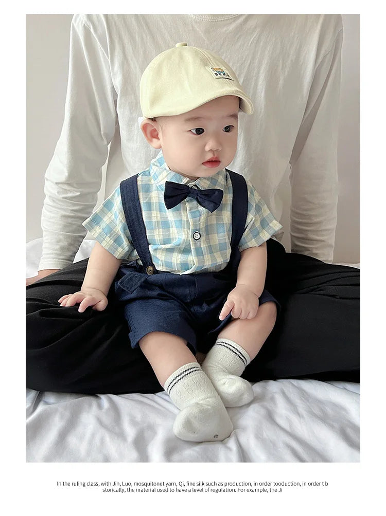 Boy Suit Summer Newborn Baby Clothes Summer Gentleman Children's Dress Lattice Shirt Strap Short+socks 3-piece Suit.