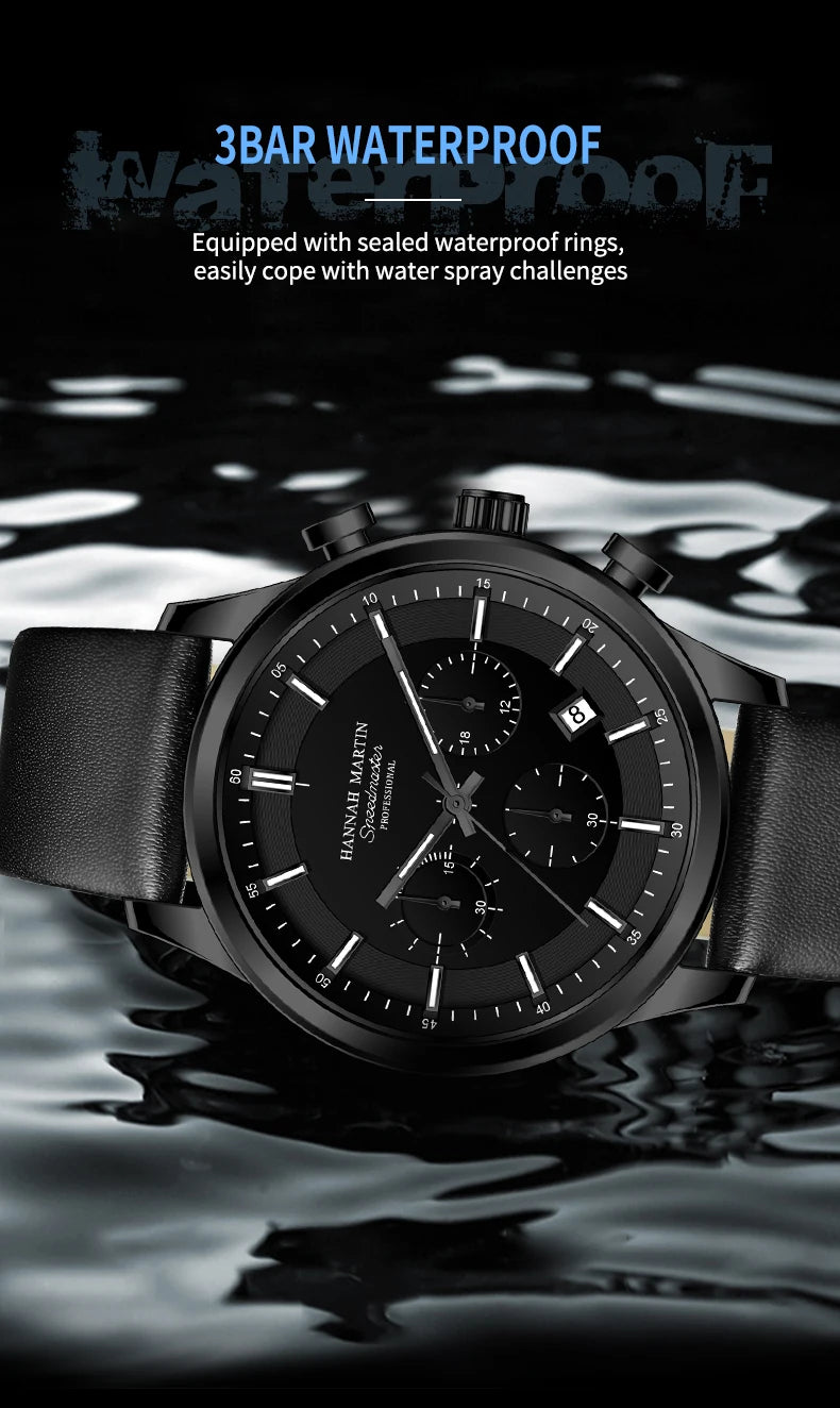 Hannah Martin Brand Men Watch Multifunctional Timing Dial Casual Sports Leather Original Quartz Movement Business Watch for Men