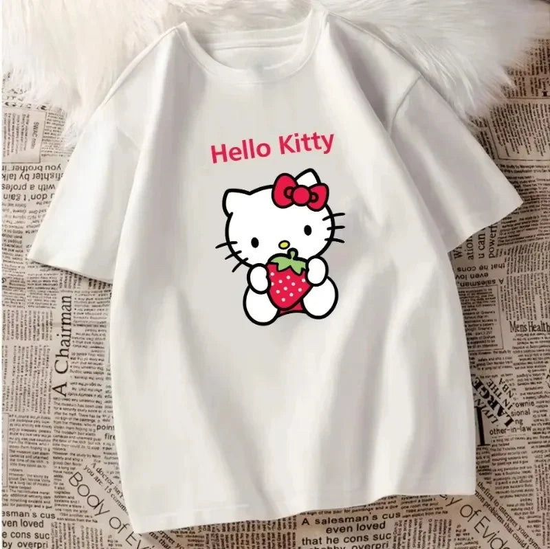 Hello Kitty Cotton T-shirt Women Men Couples Cute Printed Trend Tops Oversized Y2k Unisex Couples T-shirts Female Male Clthing