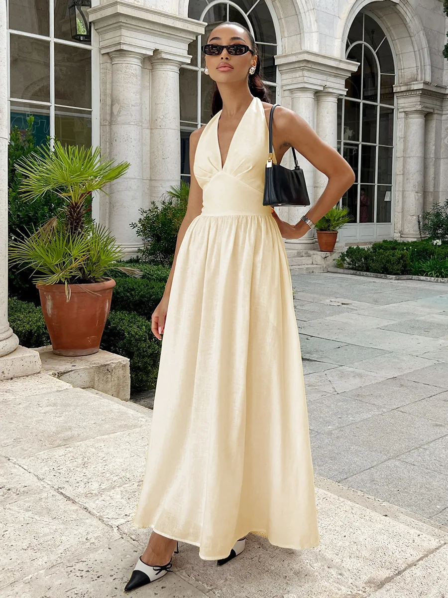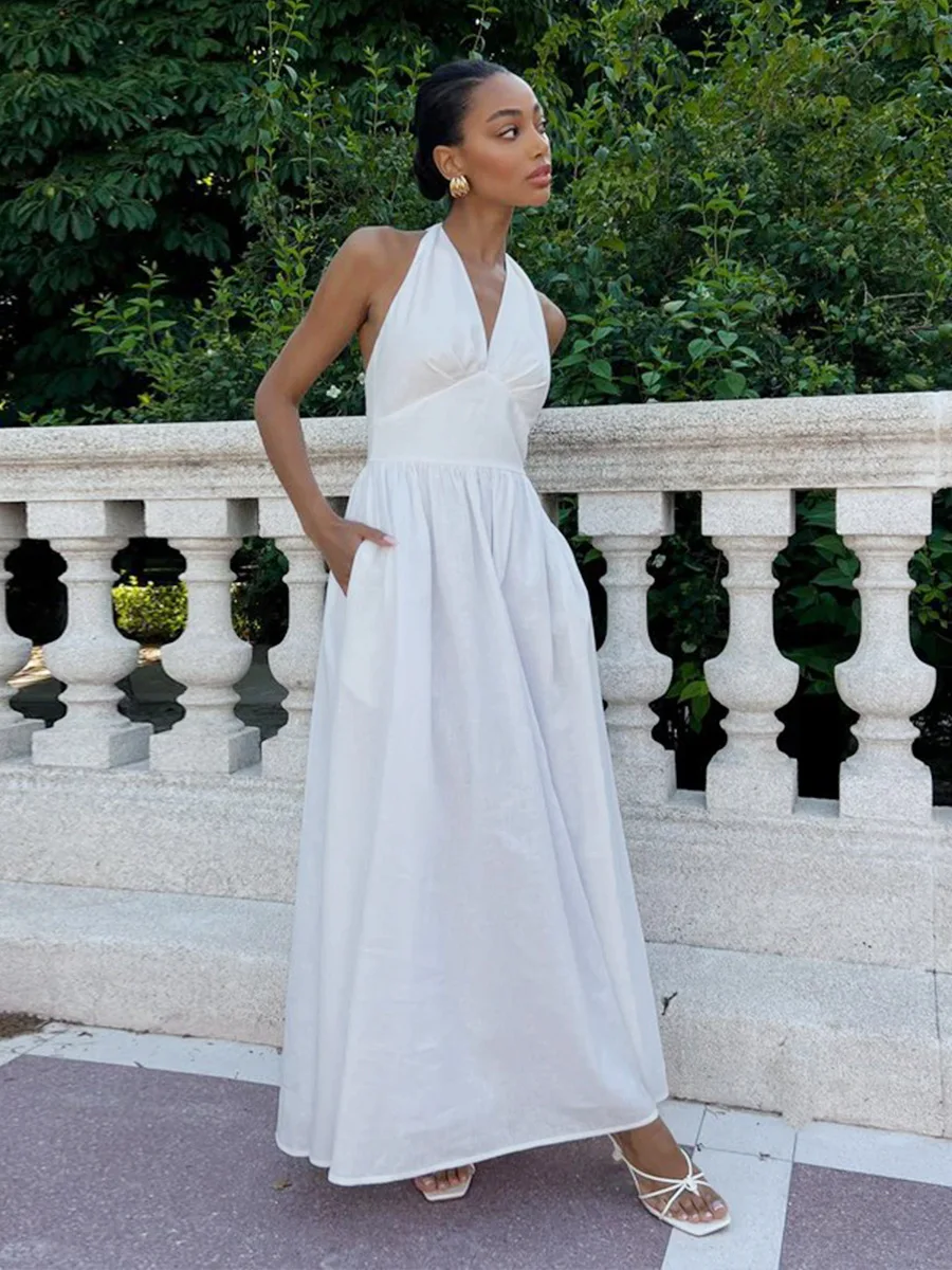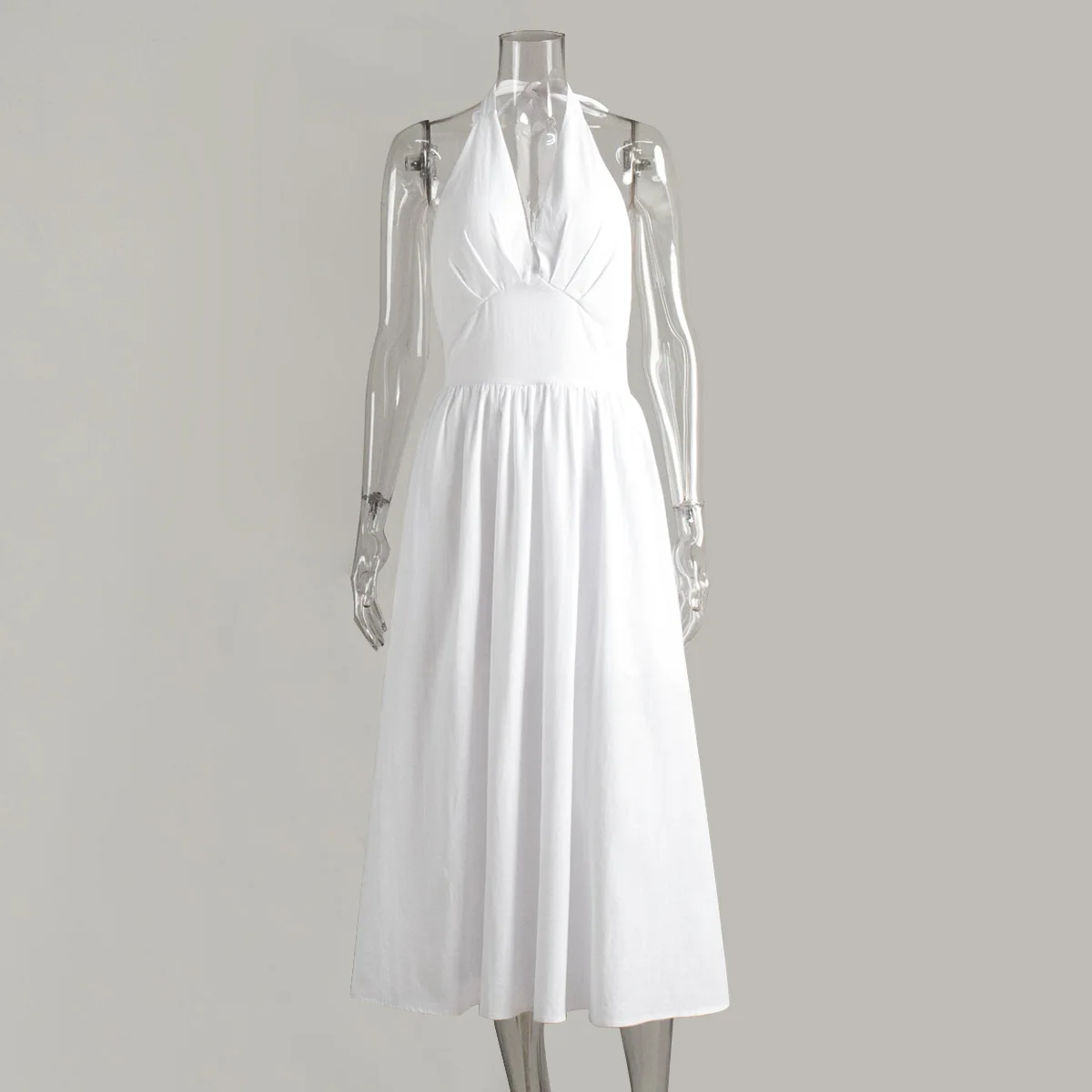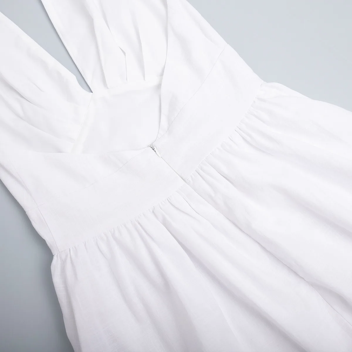 Talenza Spring V-Neck Long Dress Women White High Waist Slim Backless Lace-up Beach Holiday Dress Sleeveless Casual Female Dress