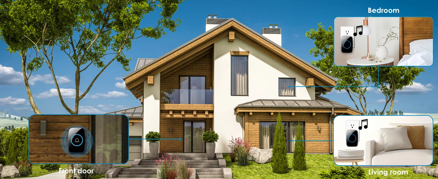 Waterproof Door Bell Kit, Distinguish Front and Rear Doors, Over 1000 feet Range and 60 Chime Wireless Doorbell for Smarthome