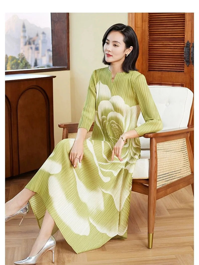 Women's Dress Womens Dresses Elegant and Peony Flower Print Cropped Sleeve Pleated Loose Dress Women's Miyake Round Neck Dress