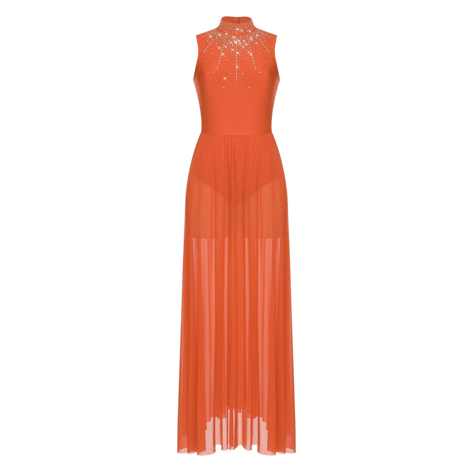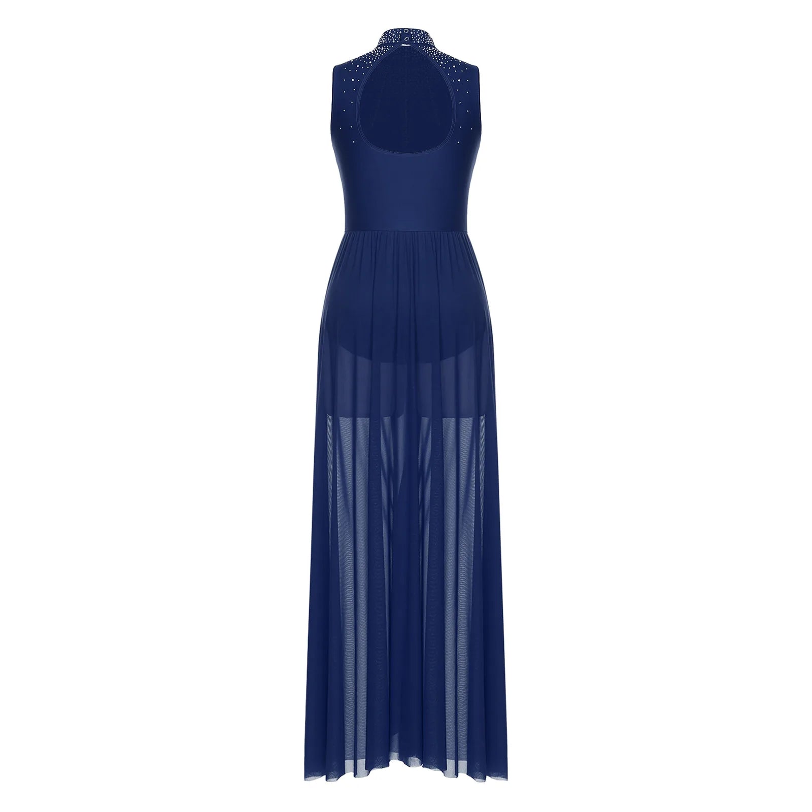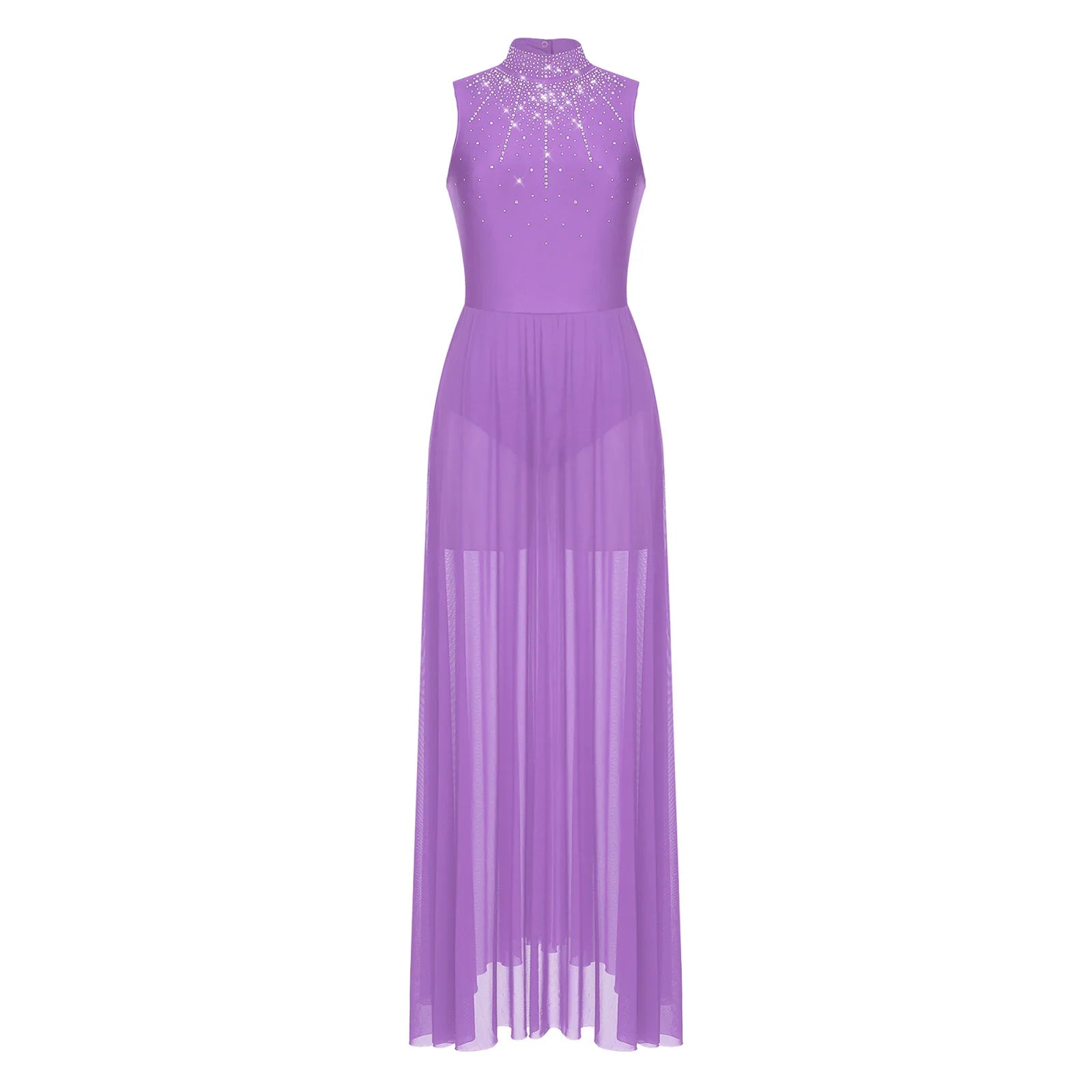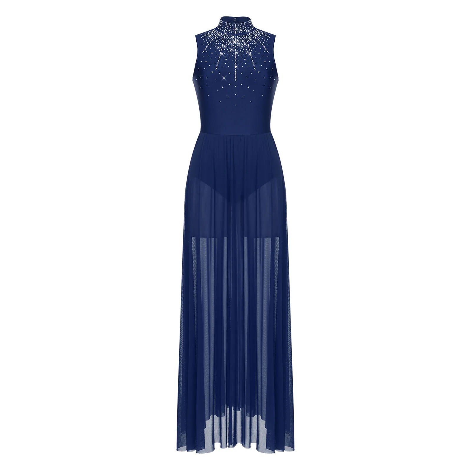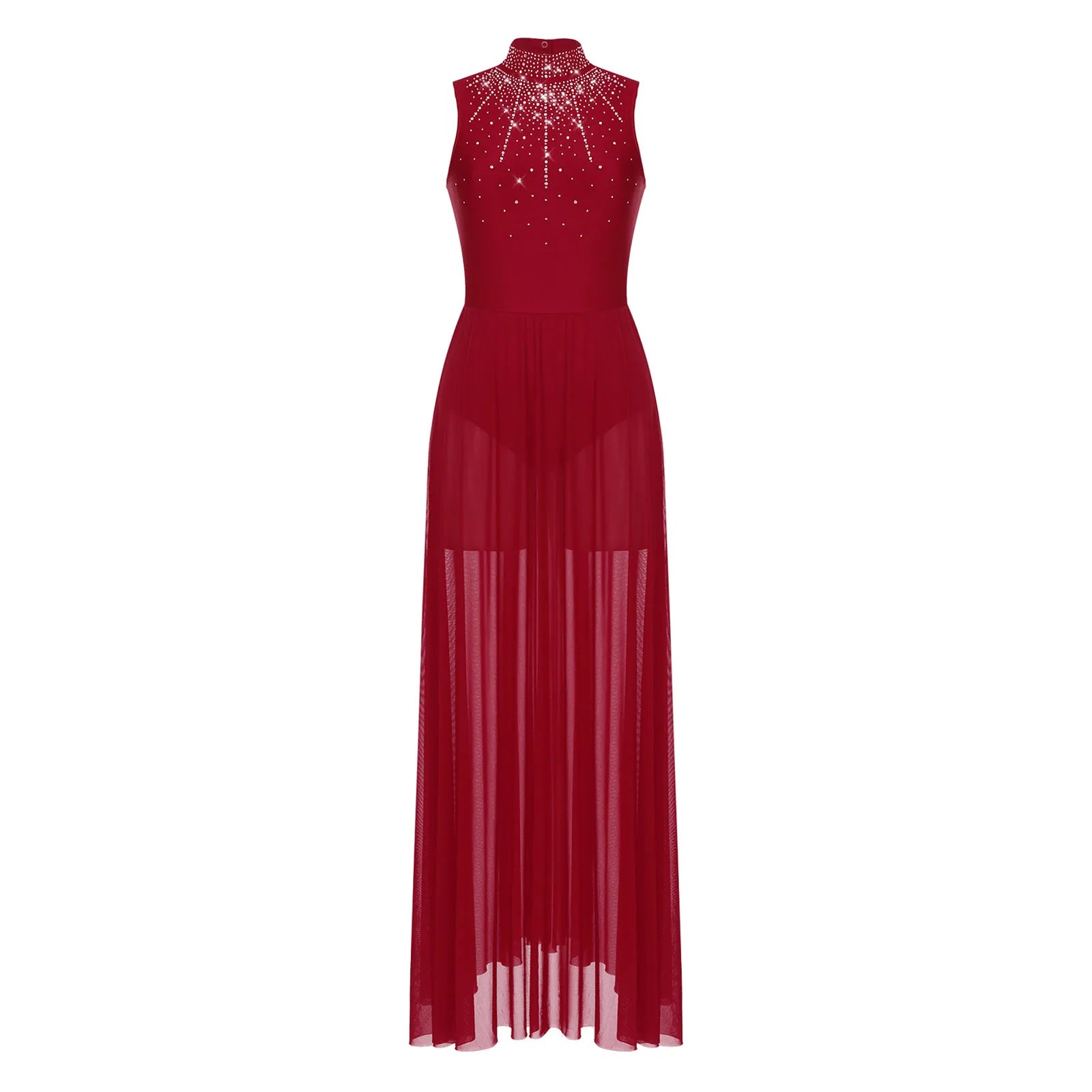 Womens Lyrical Dance Dresses Mock Neck Wide Hemline Shiny Rhinestones Maxi Dress Sleeveless Modern Contemporary Leotard Dresses