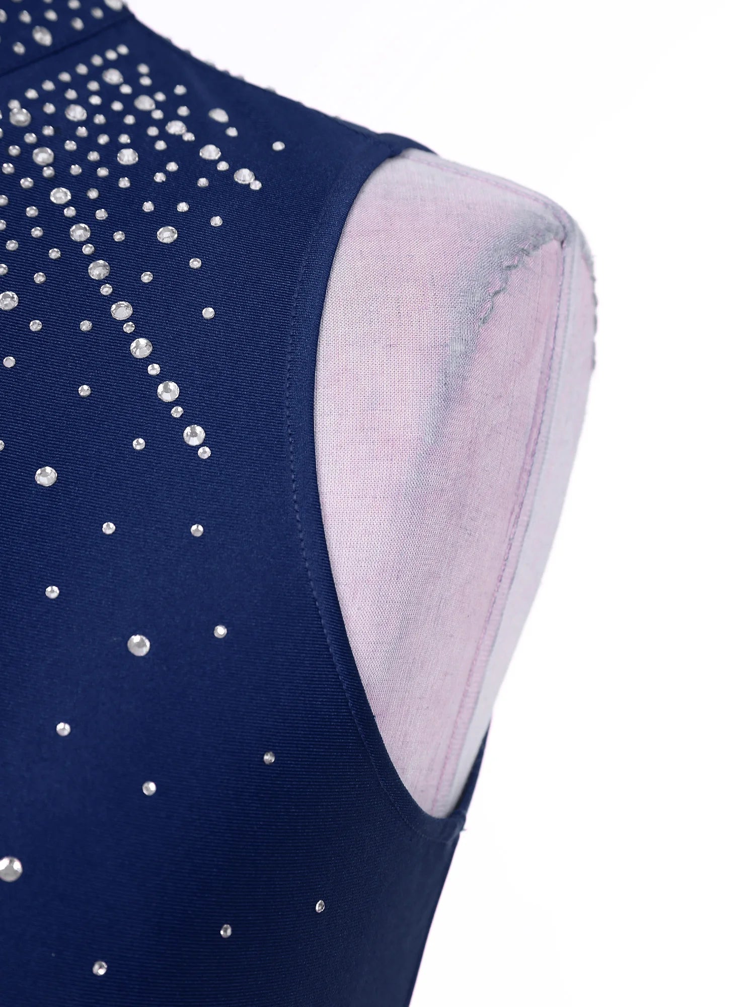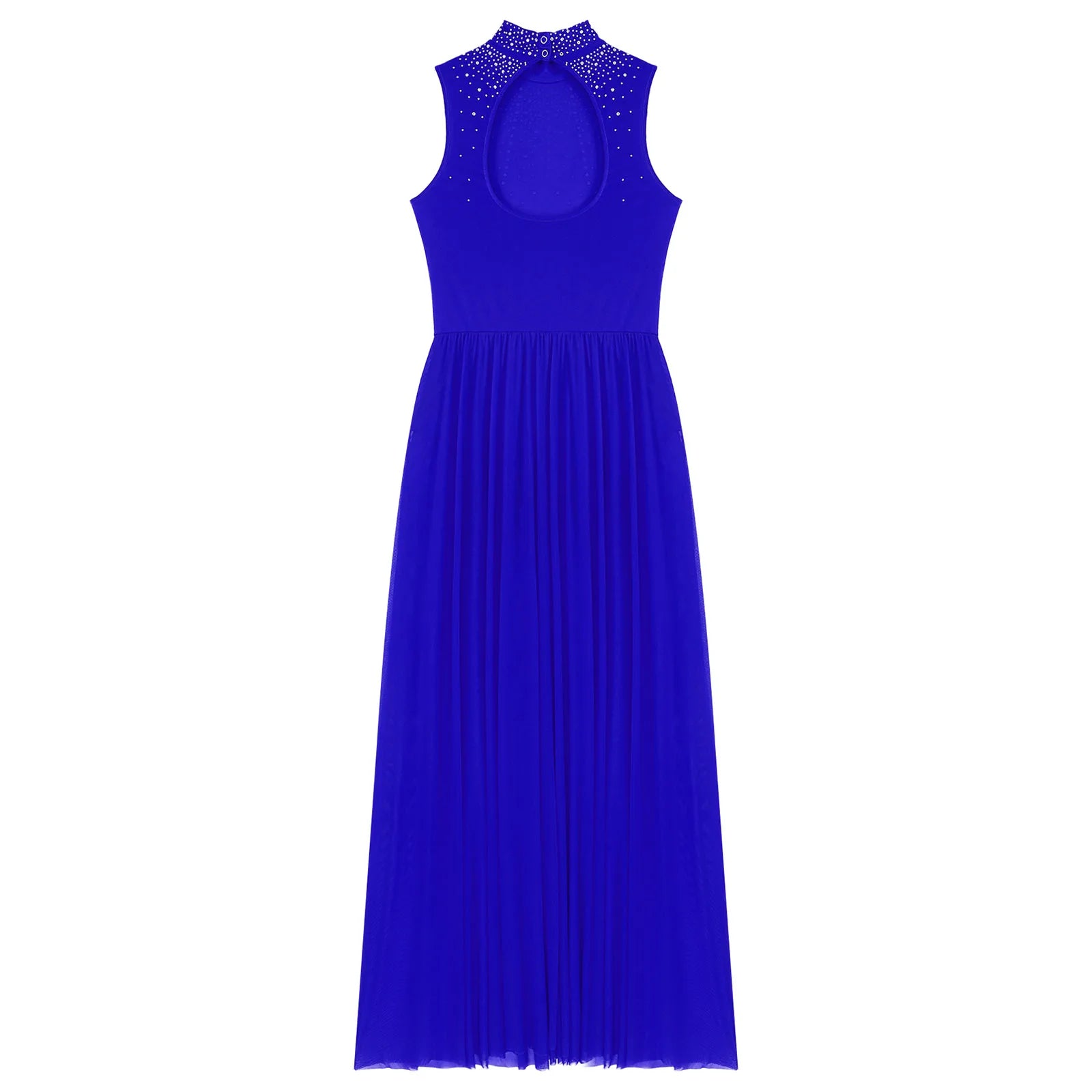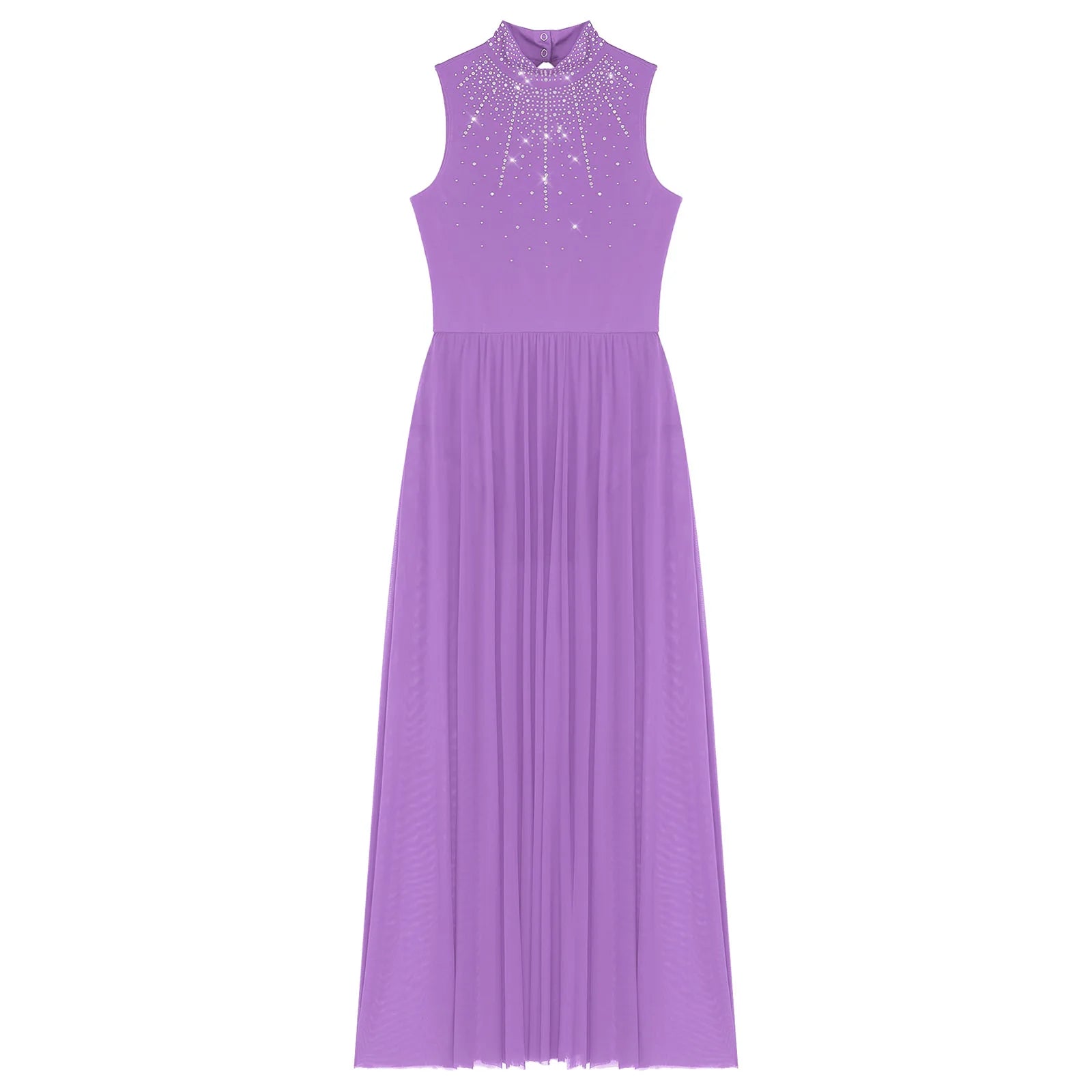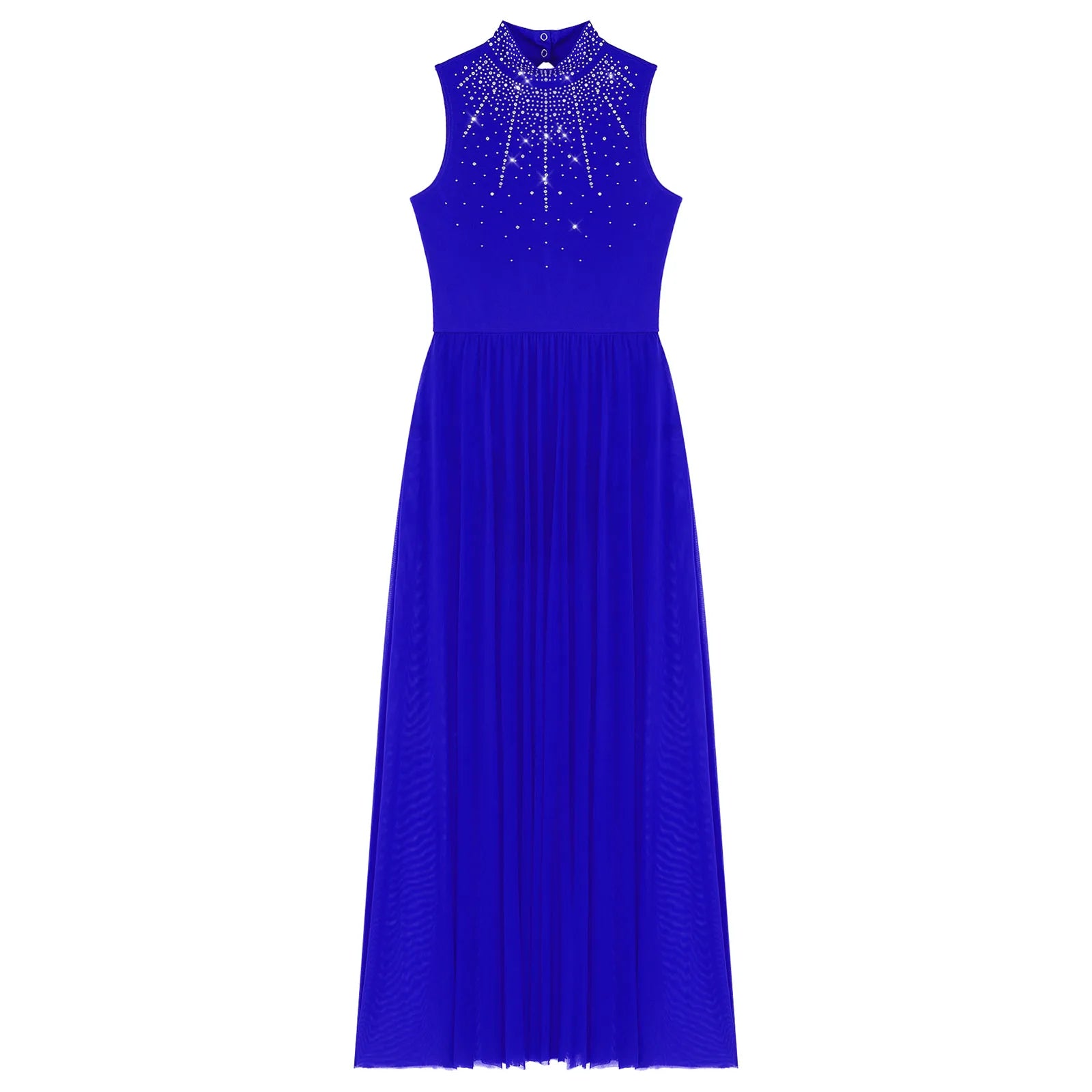 Womens Lyrical Dance Dresses Mock Neck Wide Hemline Shiny Rhinestones Maxi Dress Sleeveless Modern Contemporary Leotard Dresses
